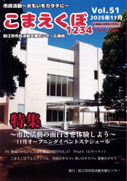 当センターの事業や市内のボランティア・市民活動団体の情報を中心に年11回の発行をし、市内の公共施設や協力店舗(広報紙の配架場所)に設置しています。年4回は当センター広報部会の皆さんによる「市民が作る取材記事 こまえがお」が掲載されます。ぜひ、お手にとってご覧ください。